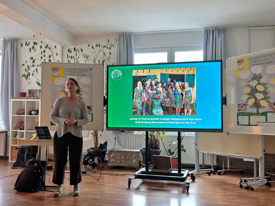 Die Referentin Nora Oehmichen überzeugte das Publikum, indem sie ihre langjährige praktische Erfahrung in der Begleitung von Schulpartnerschaften mit ihm teilte. Sie betonte, was ein*e Lehrende*r aus dem Norden durch die Teilnahme an einer solchen Partnerschaft gewinnen kann. Anhand ihrer eigenen Erfahrungen zeigte sie, wie dieser Zugang zu einer anderen Kultur ihr ein besseres Verständnis für Menschen aus fremden Kulturen ermöglicht und ihren Horizont erweitert hat. Ihre teilnehmenden Schüler*innen haben eine außergewöhnliche persönliche Entwicklung durchlaufen und engagieren sich teilweise auf politischer Ebene in ihrem Land. Vor einigen Jahren kandidierte eine ihrer Schülerinnen, die am Austausch mit Benin teilgenommen hatte, für die Grünen bei den Bundestagswahlen.