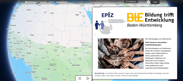 Diese Mapstory, die von dem Referenten Andreas Lange im Auftrag des Programms Bildung trifft Entwicklung erstellt wurde, zeigt die Spur der Edelsteine auf und die fatalen Folgen für Menschen und Umwelt. Aber sie zeigt auch wie es anders gehen kann, wie letztlich alle von dem schönen Glanz der Edelsteine profitieren könnten.